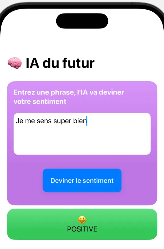 NavigationStack avec un titre.purple en dégradé18TextField avec un placeholder “Entrez votre phrase”, ce TextField sera notre variable modelInput pour envoyer une phrase au réseau de neurones.Button avec un texte qui va lancer l’analyse de la phrase.